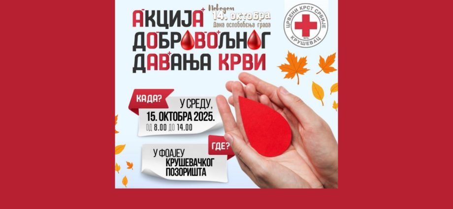 Akcija dobrovoljnog davanja krvi, povodom Dana oslobođenja grada, održava se u sredu, 15. oktobra u foajeu Kruševačkog pozorišta.