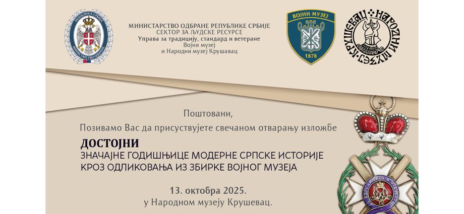 Povodom proslave Dana oslobođenja grada Kruševca u Drugom svetskom ratu, u Svečanoj dvorani Narodnog muzeja Kruševac biće otvorena gostujuća izložba Vojnog muzeja „Dostojni – značajne godišnjice moderne srpske istorije kroz odlikovanja iz zbirke Vojnog muzeja”. Svečano otvaranje je danas, 13. oktobra, u 18 časova.