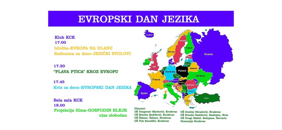 U 17 časova je otvaranje izložbe pod nazivom „Evropa na dlanu“ i radionica za decu „Jezički stolovi“. U 17 i 45 časova počinje kviz „Evropski dan jezika“, a u 19 časova ju Beloj sali počinje projekcija filma „Gospodin Blejk“. Ulaz je slobodan.