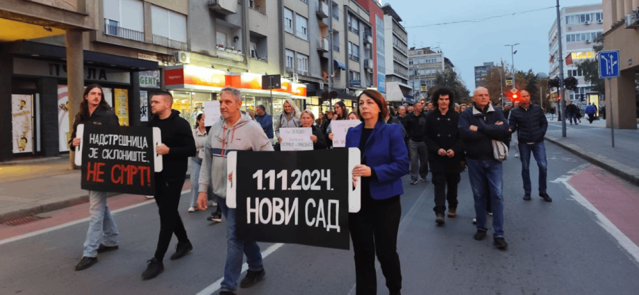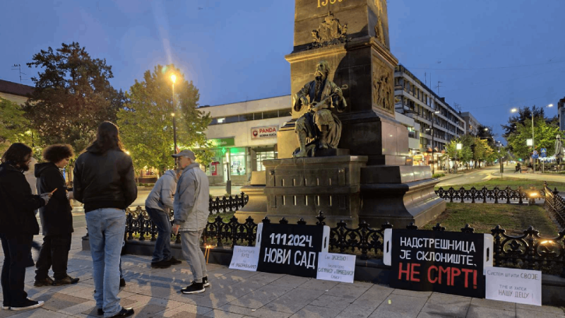 Okupljeni su se potom u tišini prošetali do Trga kosovskih junaka, gde su zapalili sveće i poređali transparente sa natpisima: „Nadstrešnica je sklonište, ne smrt“, “Svi zajedno zaslužujemo sigurniju i pravedniju Srbiju“, „01.11.2024. Novi Sad“, “Sisitem štiti svoje. Tuče i hapsi našu decu“.