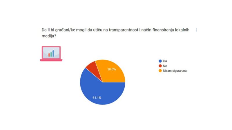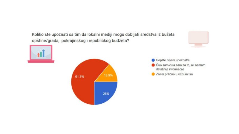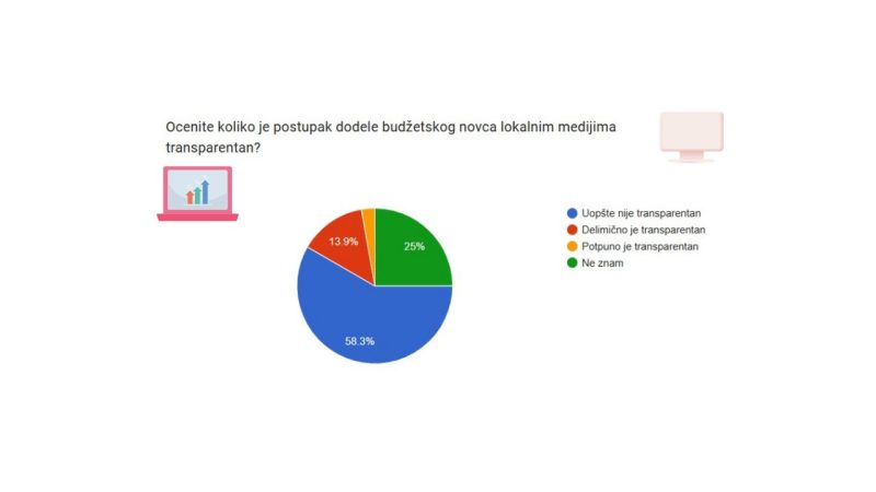 Da proces dodele budžetskog novca lokalnim medijima uopšte nije transparentan smatra više od 58 odsto učesnika ankete, a dodatnih 25 odsto nema odgovor. Više od 80 odsto je navelo da nema dovoljno informacija o tome koji mediji dobijaju sredstva iz budžeta, a više od 72 odsto da ne znaju na koji način se taj novac troši.