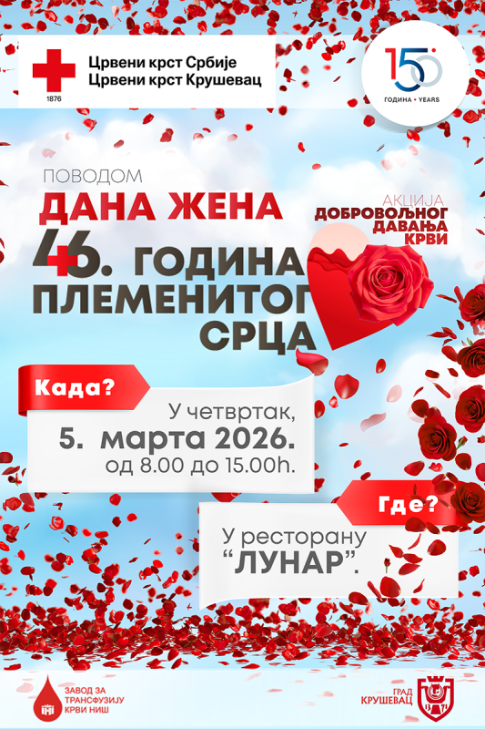 Crveni krst Kruševac, povodom Međunarodnog dana žena i ove godine organizuje osmomartovsku akciju dobrovoljnog davanja krvi. Ova humanitarna akcija koja već tradicionalno okuplja davaoce iz celog Rasinskog okruga, jedna je od najmasovnijih u Srbiji i regionu.