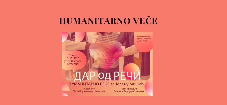 Humanitarno književno veče ,,Dar od reči”, koje organizuju učenici Kruševačke gimnazije, održaće se večeras (10. decembra) sa početkom od 19.30 časova u Klubu Kulturnog centra Kruševac. Dobrovoljni prilog publike biće namenjen za lečenje Jelene Mišić (14), kojoj je ove godine dijagnostikovan zloćudni tumor koji prelazi granice mozga.