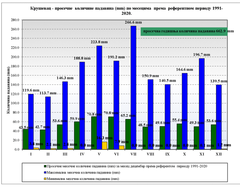Podaci RHMZO pokazuju i da je srednja godišnja količina padavina u Kruševcu za ceo period rada meteorološke stanice u našem gradu (skoro 100 godina), iznosi 653,9 mm. Najveća količina padavina tokom jedne godine je zabeležena 1955. godine, 1105,1 mm, dok je najmanja registrovana 2000. godine, 385,1 mm.