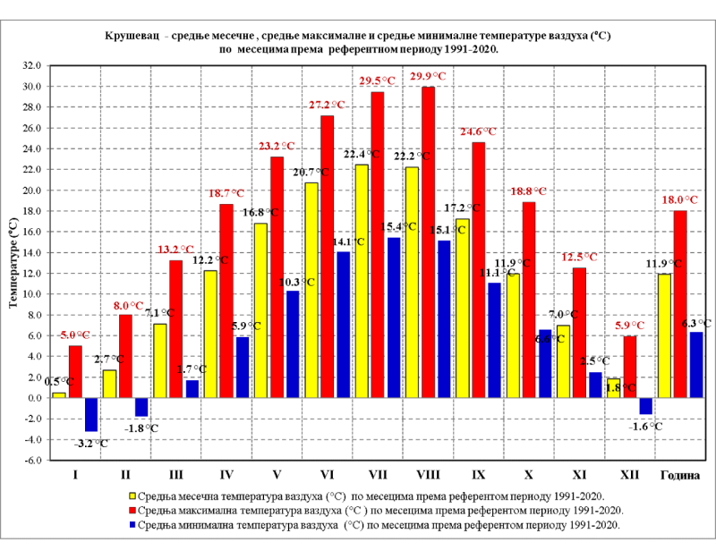 Apsolutni dnevni maksimum temperature vazduha u Kruševcu zabeležen je 26. jula ove godine, 44,0 °C, a minimum je bio -30,0 °C, 7. januara 1947. godine.